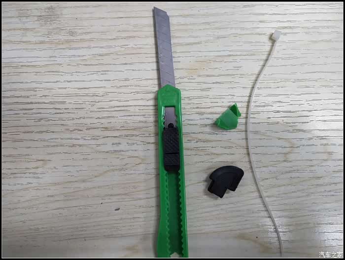 一共3样东西,挡把头一个、扎带一根、美工刀一把。