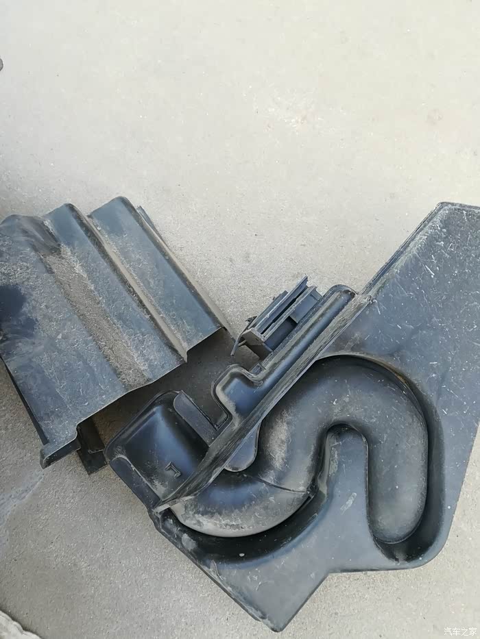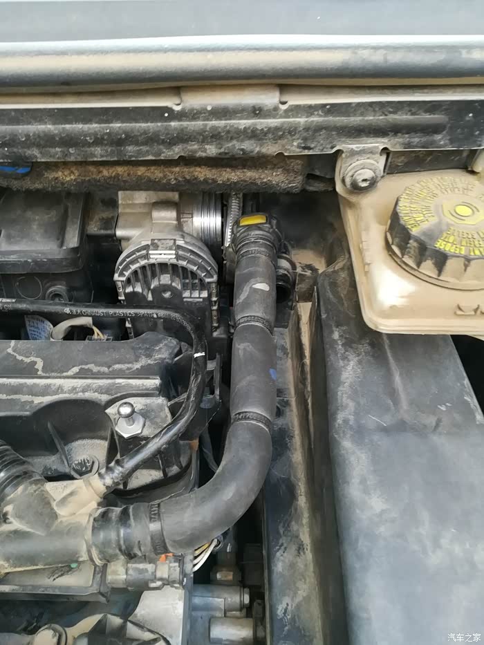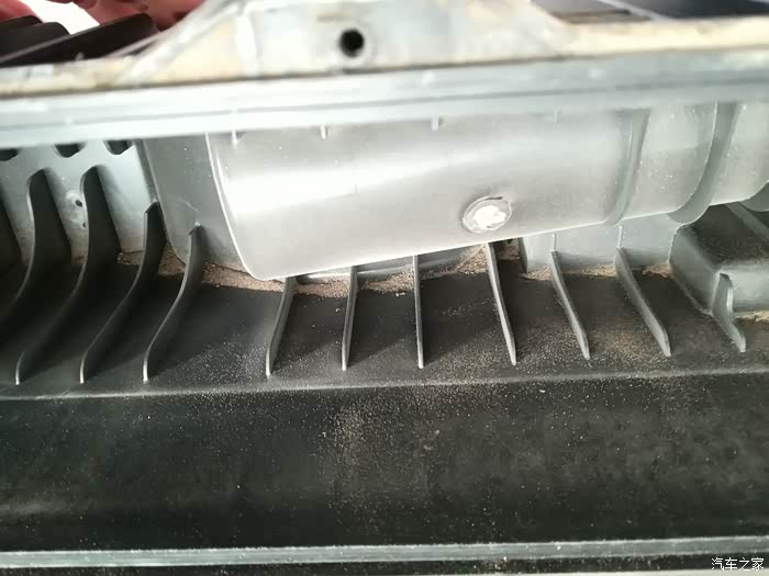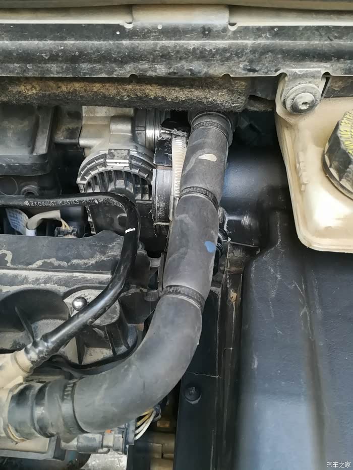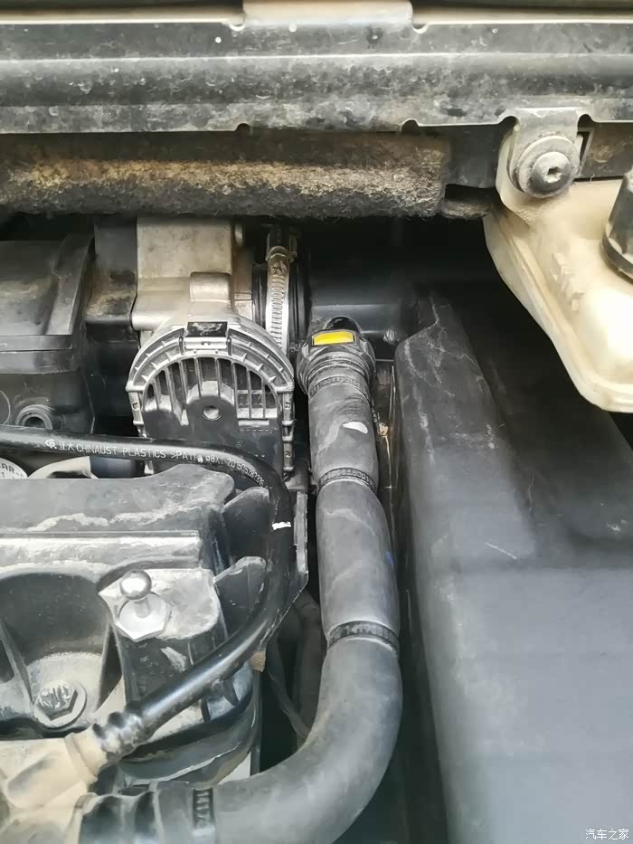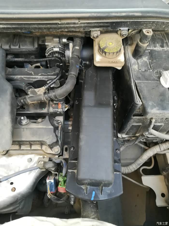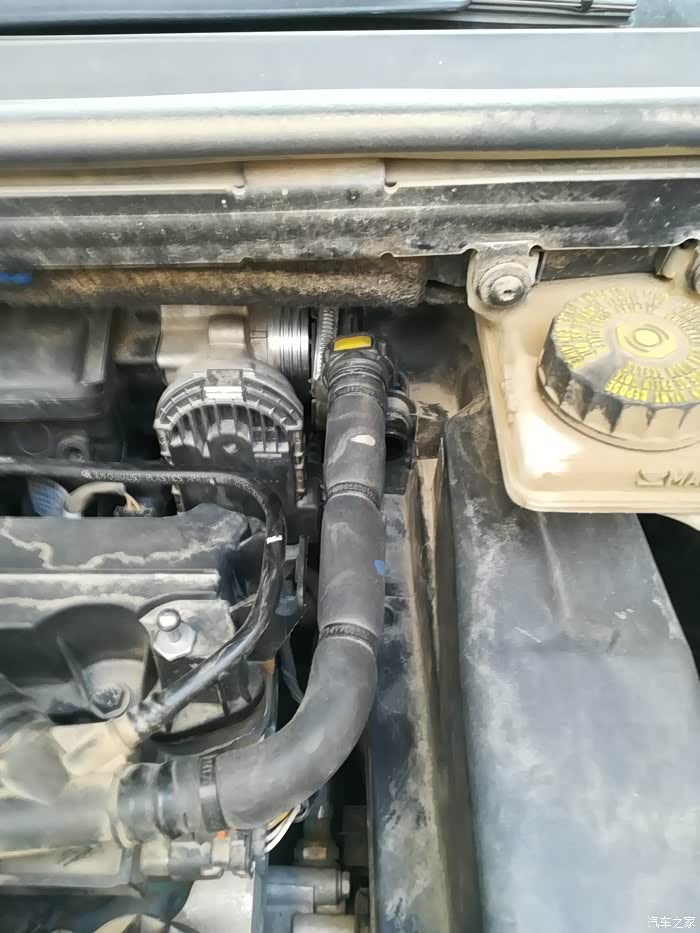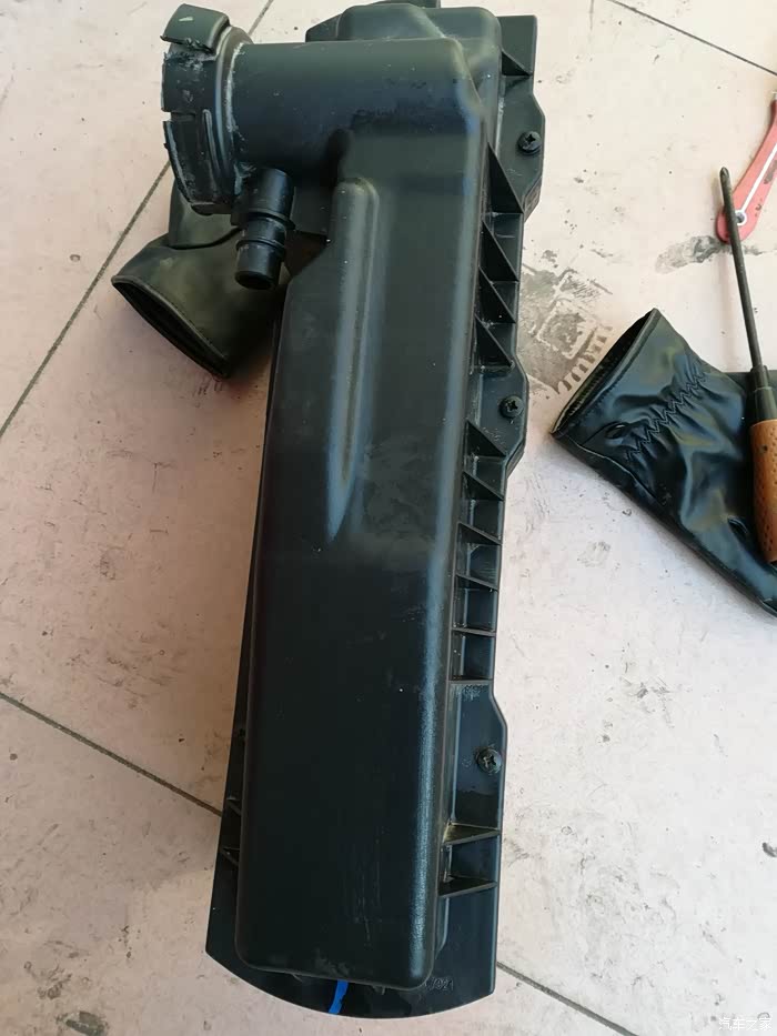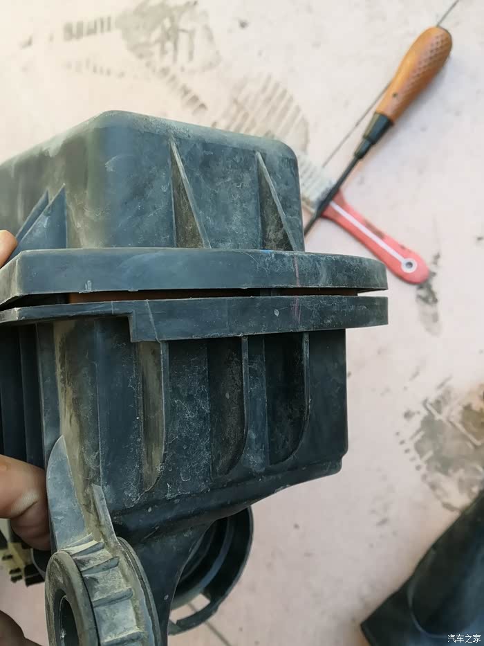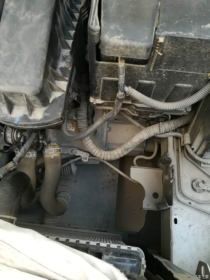 在这照片少点,毕竟边干边照来不及。我详细说一下。第一最好先松铁箍,因为那个黄色卡子是要上下一起用力按得,那里空间太小不好下手,所以先松铁箍然后向外拿一点空气格,有空间了再按卡子拽下管,期间把那个黑色的细管从卡槽抬起点,不要紧不会坏,全程要稳,用多大力心里有点底。这样就可以拿出空气格了。不用挪刹车油壶,当然挪开更好干活。