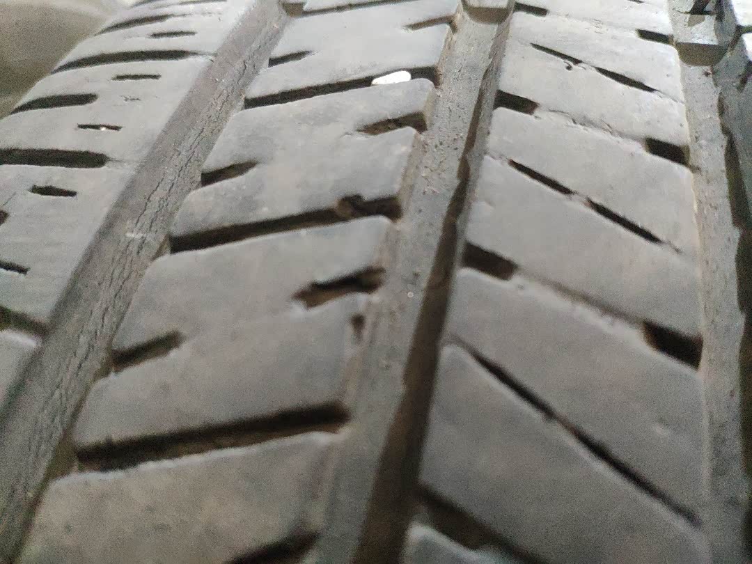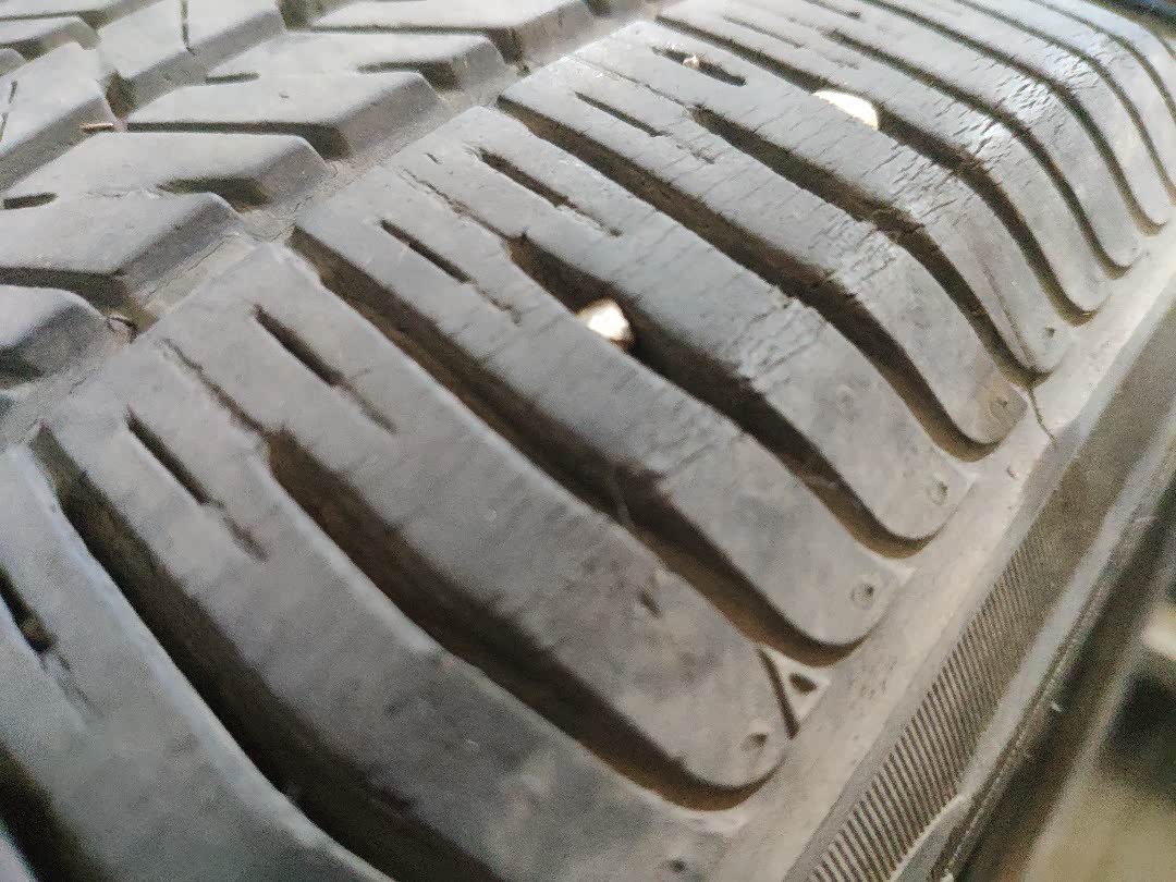 拆下的轮胎,纹理还很深,磨损不严重,就是上面已经有很多细小的裂纹了,有了很大的安全隐患