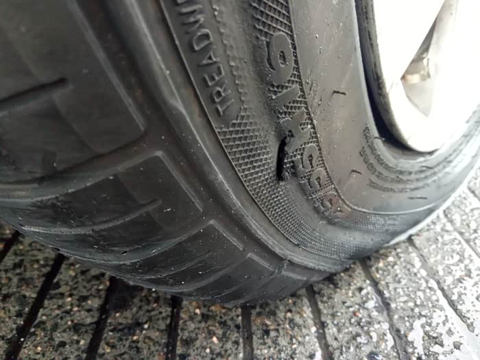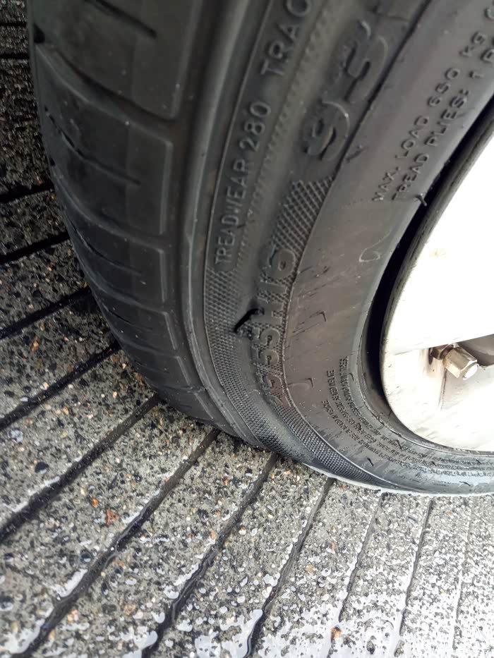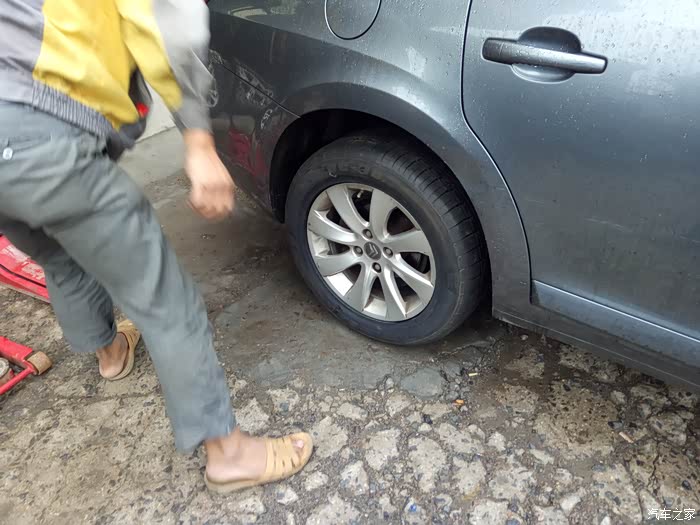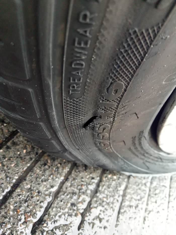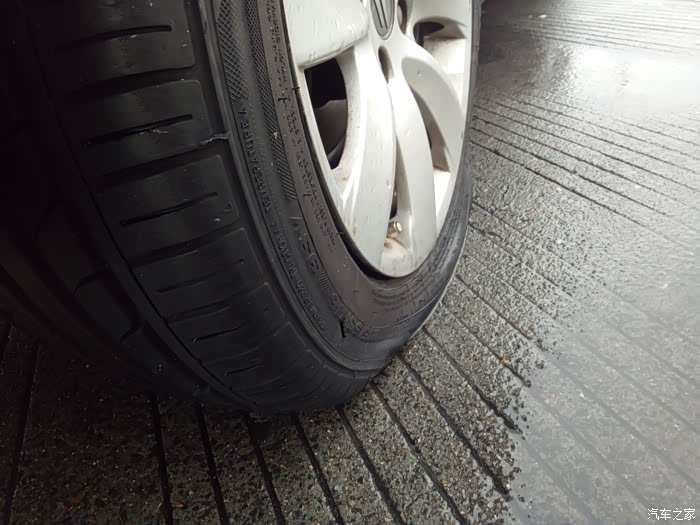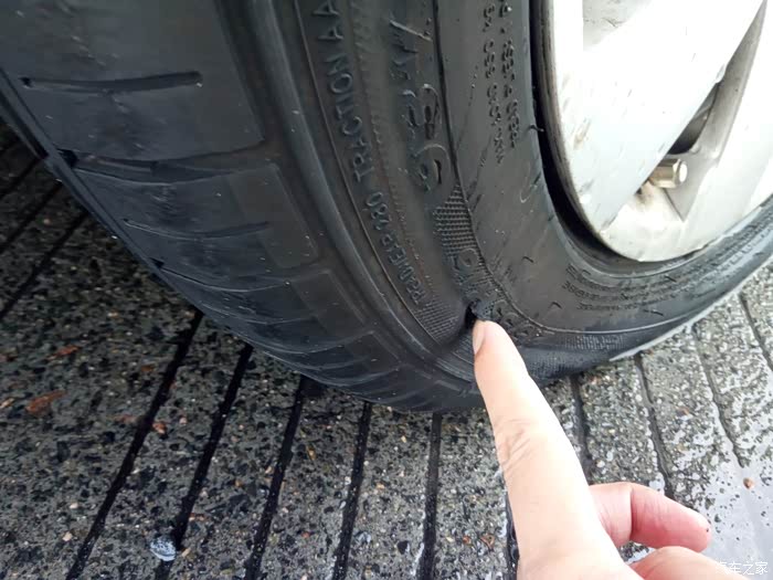 保养完以后就直接上高速了,结果开了不到10分钟,压了一堆杂物,因为下雨视线不好,发现的时候很近了,不想乱打方向,直接压了过去,开始还以为没事,后来越开越不对劲,方向也往右跑偏了,阻力也越来越大,基本可以确定轮胎出问题了,鉴于下一个服务区只有5、6公里了,打了双跳慢慢开,挨到了服务区,下车一看,我滴妈呀