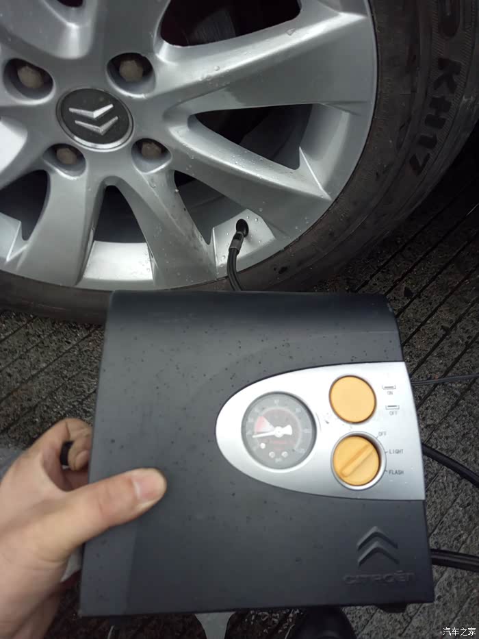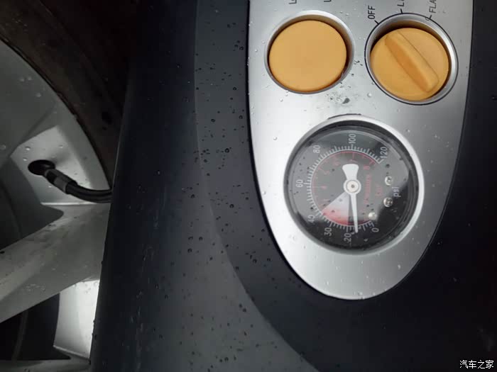 因为备胎长期不用,胎压也不够了,拿出随车的充气泵,每次充到不到1.8就断电,压力不够,郁闷……