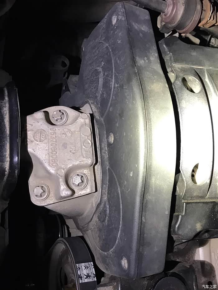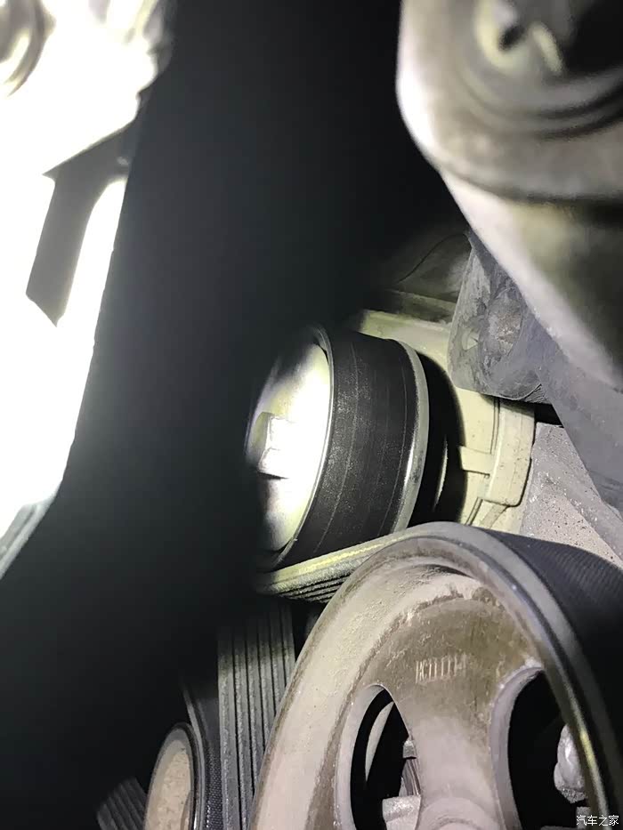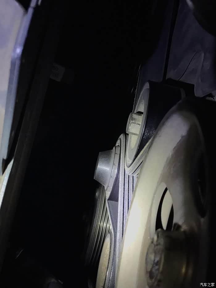 先得找千斤顶顶住发动机在拆掉旁边的支架,只有拧开螺丝就看到正时三件套是这样的。 你经常能看到134齿的皮带什么什么的就这个。 你要说看到正时皮带了这个肯定不对的,他整个的包在里面,开机盖根本看不到。 能看到的皮带现在还在缠绕着的两个中间平滑没有牙齿的轮子左边的是涨紧轮,右边是惰轮。 涨紧轮主要管压住皮带可调,惰轮不能动。更换三件套就是这三件,皮带,涨紧轮和惰轮。具体作业我没拍,大概其就是涨紧轮往驾驶室方向搬,整个皮带松开拿下来,拆轮,装新的上去,缠皮带,用涨紧轮压紧。 中间上面两个轮要用销固定不动,错齿2个发动机就会顶缸。 换正时时候会检查水泵,水泵如果需要换一起就换了,不需要就装好。封盖。下一步看电机皮带