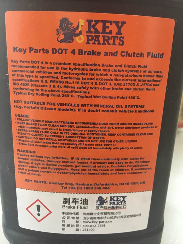 对这款刹车油总体印象:首先快递内包装不好,没有减震泡沫之类的保护,再一个就是瓶体全外文,让消费者搞不清楚产品的品牌、使用注意事项等,建议销售商家弄一个中文的说明书。