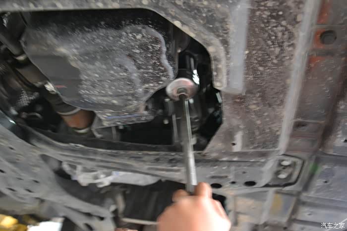 检查完底盘,机油也放完了,换上新的机滤,装回放油螺栓。这不算完,底盘的油也要清理干净,为的是哪儿漏油了能及时发现。