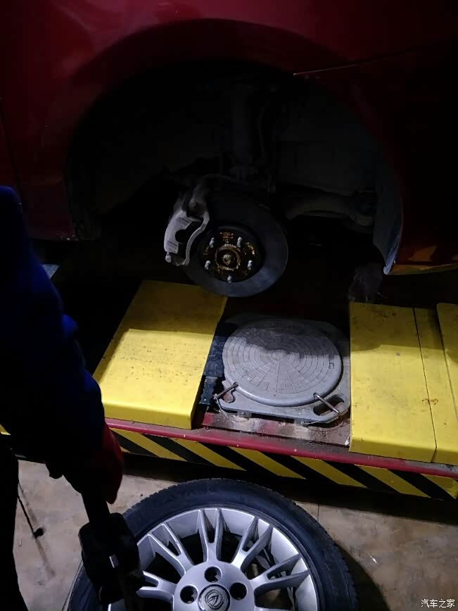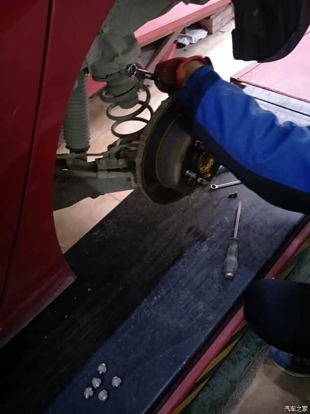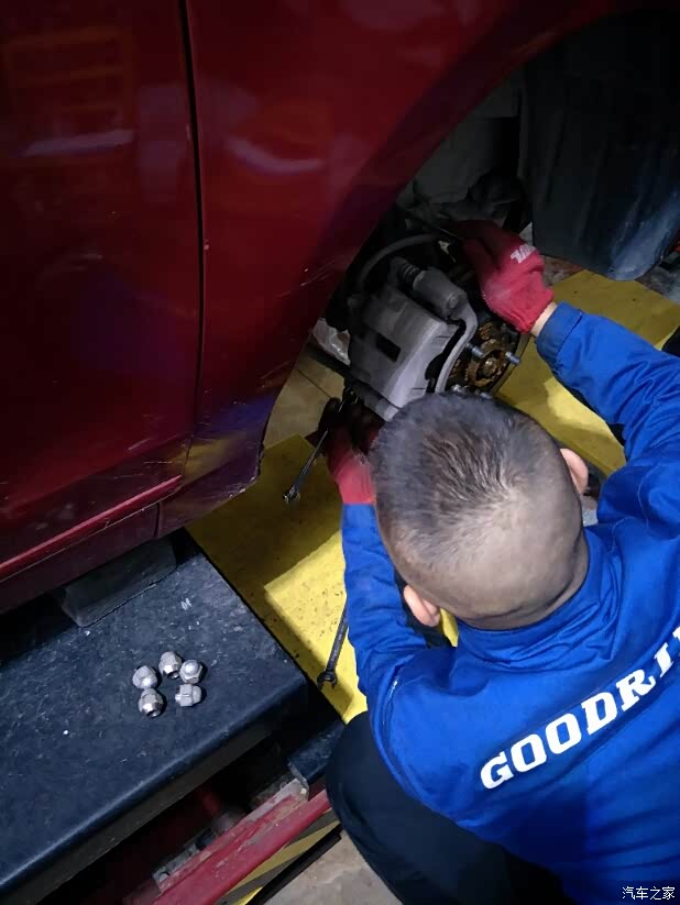 路程八万多才换第一次刹车片,到达维修店,修车师傅在准备工具及必须品。