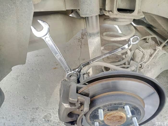后轮卡钳有上下两个螺丝,用13的梅花和16的叉扳把两个都拆下,油管不用拆。
