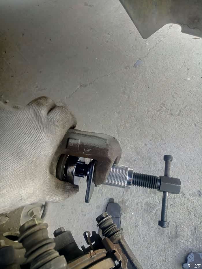 因后刹车分泵出来太多无法放下回位工具,所以需要用回位工具的螺丝杆和头卡住分泵旋转用力往里压(后轮很紧,回位工具一开始还放不进去,各位随机应变吧)