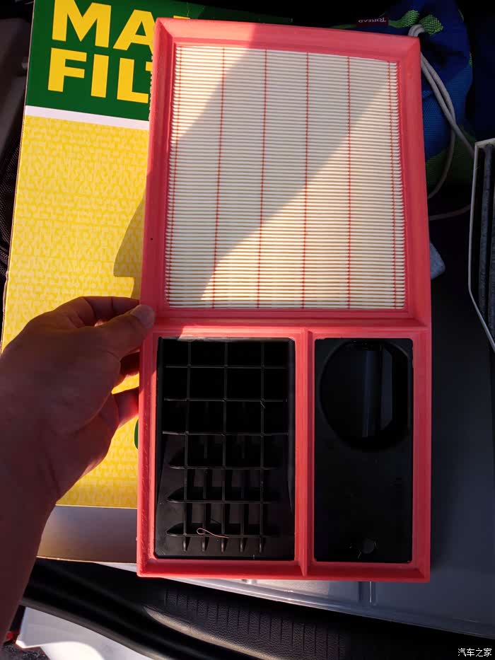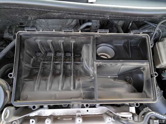 空气滤芯盒底部,上边的圆筒就是节气门,从这个角度看节气门处灰尘也很多
