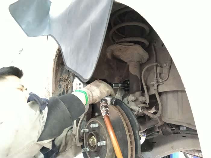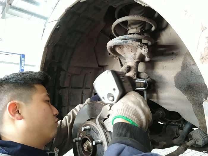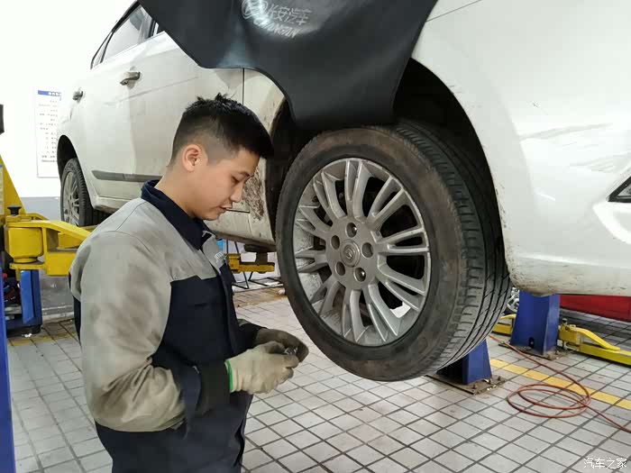 新的前连接杆总成更换完成,师傅开始安装拆除下来的轮胎