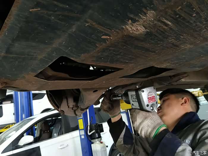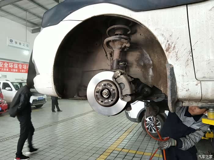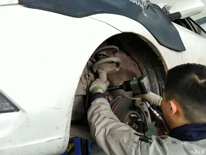 工作人员为确认是前连接杆总成原因而准备拆除轮胎确认以便更换