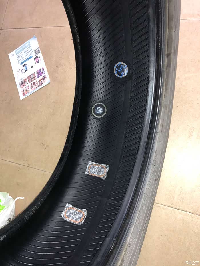 原厂邓禄普轮胎 其中一条胎补了5个钉子 还有一个补丁没拍到