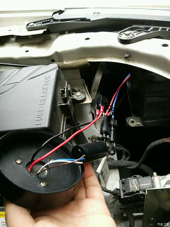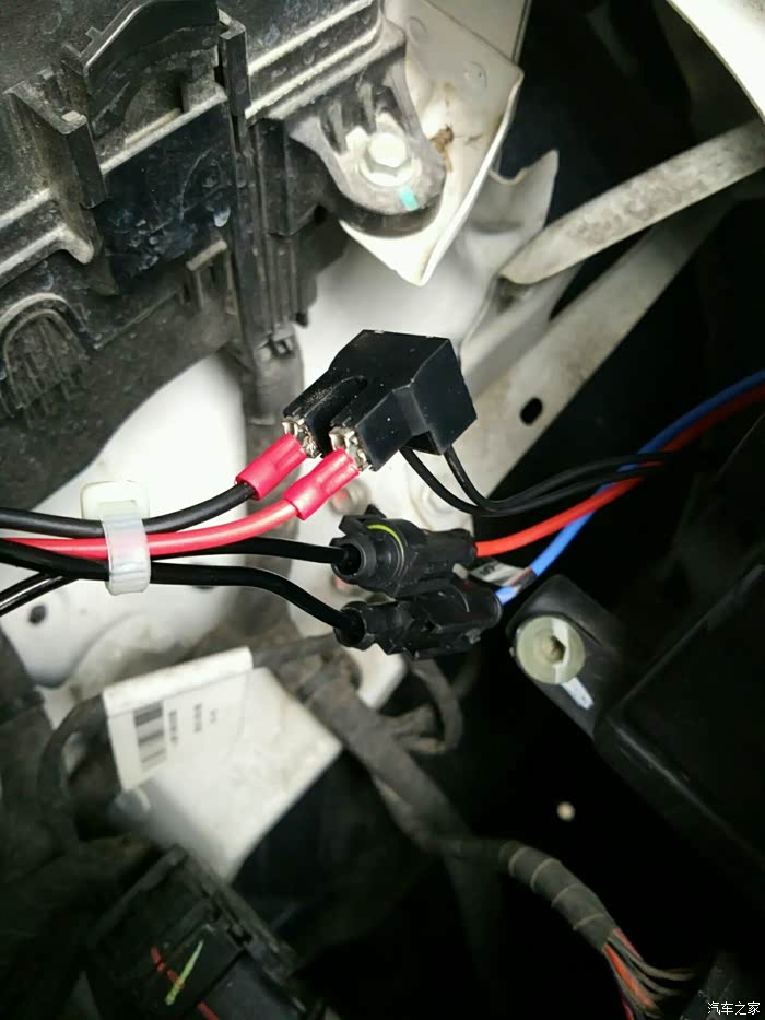 来个接线大图,就4根线,两根接灯泡的插头一公一母不会插错,剩下电源进线分正负,红的正,黑的负。注意这个图,原来灯泡座线往下,右边的是正,我帮车友改一台也是这样,因为不是每个车友手上都有万用表,注意看喔。