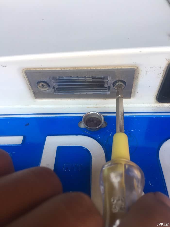 打开后备箱,用十字螺丝刀把这颗螺丝拧下来。