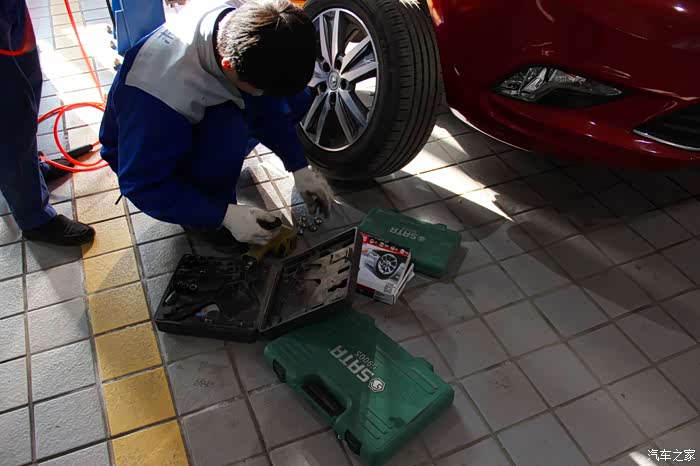 PS:我们可以看到师傅做事的细心,两只轮毂都是正面向上,整齐地放在举升机立柱旁。这样就是工作标准,既整洁,又不耽误工作操作,还能有效保护轮胎。