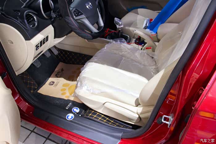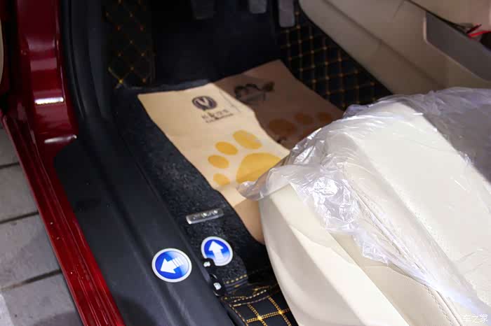 维修服务人员需要为车上安装四件套:脚垫、座垫、档把干、方向盘套。