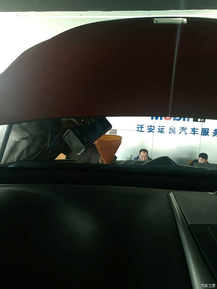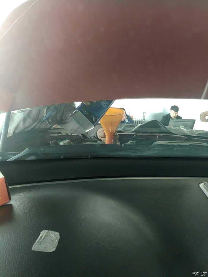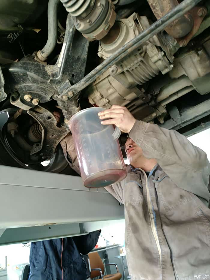 接着是制动液,我在网上买的福斯DOT4,师傅说这油外观看着不错,但是好不好,还得用后再看。还是老方法,因为店里的循环机坏了,所以用的老方法。先用吸油机把旧油吸出,然后我上驾驶位,听指示踩刹车,一个师傅加油,一个师傅在下面放油,整个过程大约10分钟,很快。因为我在车里,所以只能拍到加油的师傅。各位千万用漏斗,这个油很危险,为什么?你懂的。看看图片吧。