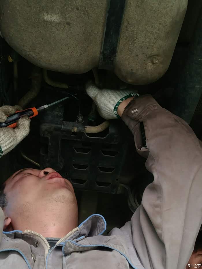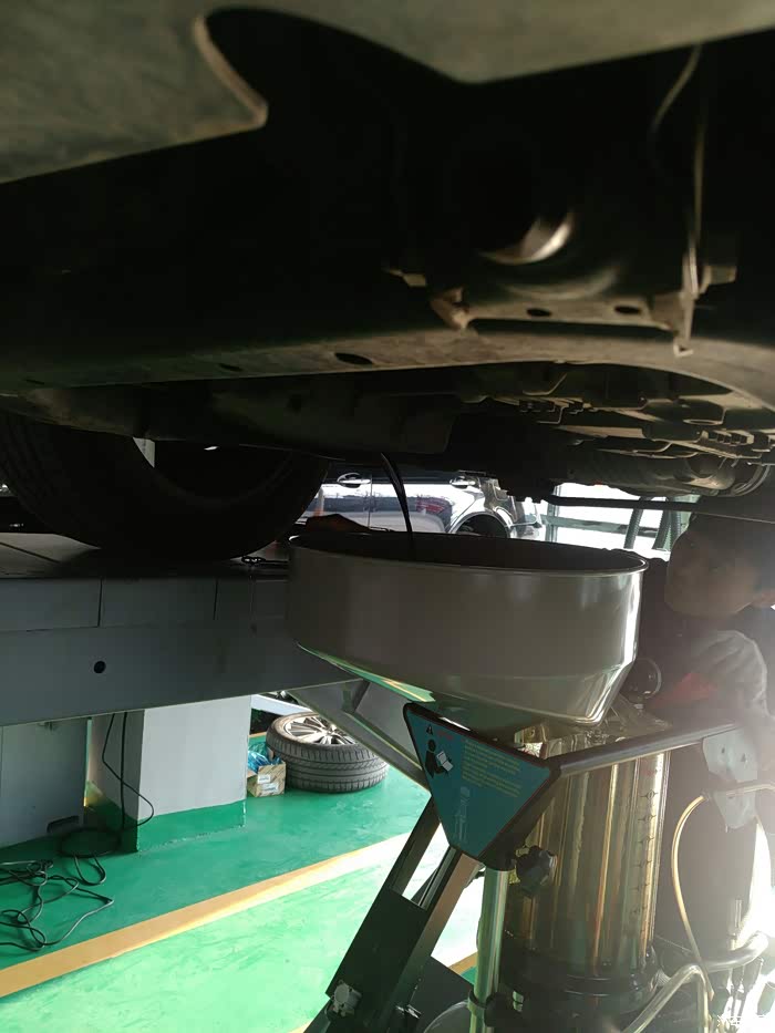 先换的变速箱油,师傅先打开放油螺丝放旧油,下图