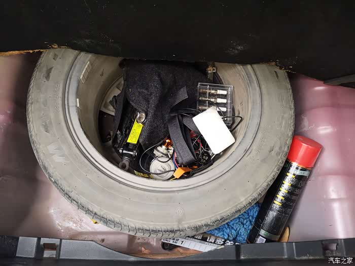 掀起后备箱垫子,呈现的是备胎,仔细看,自己改装的全尺寸备胎,轮毂和原车一模一样。