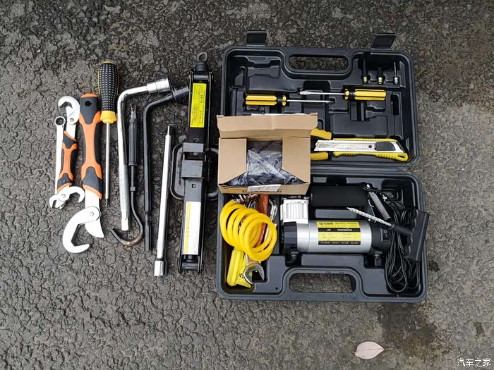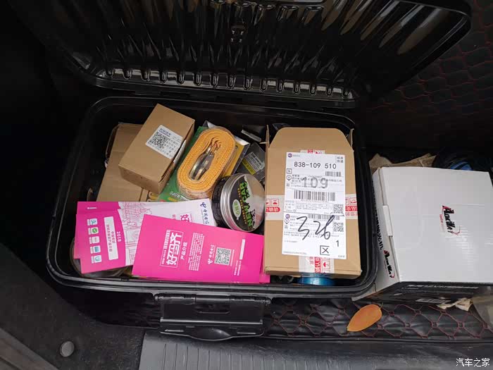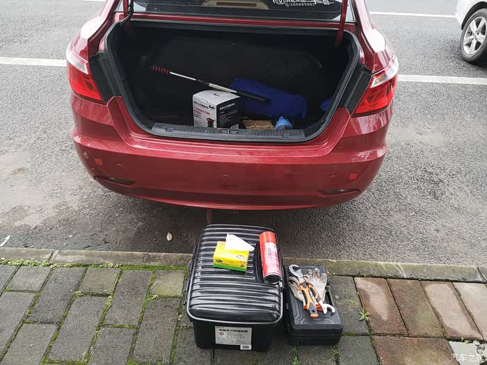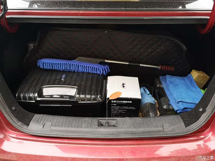 打开后备箱,挺能装的。汽车工具一大堆