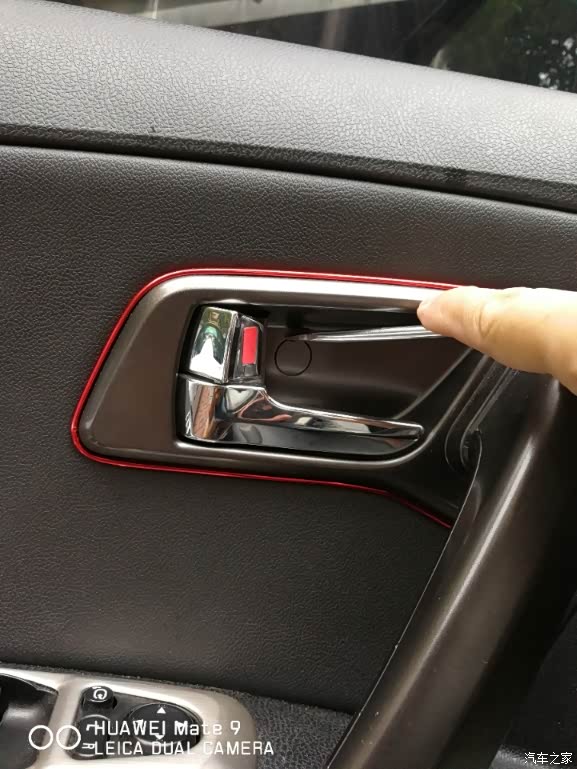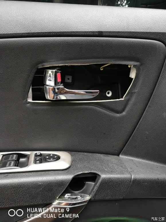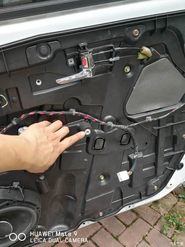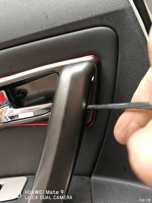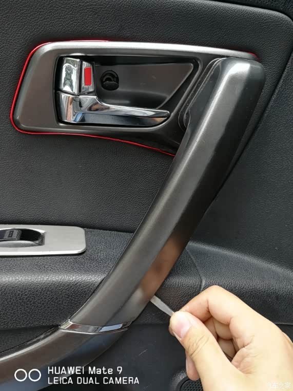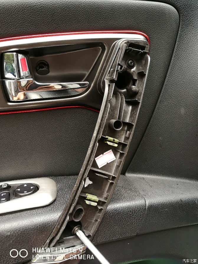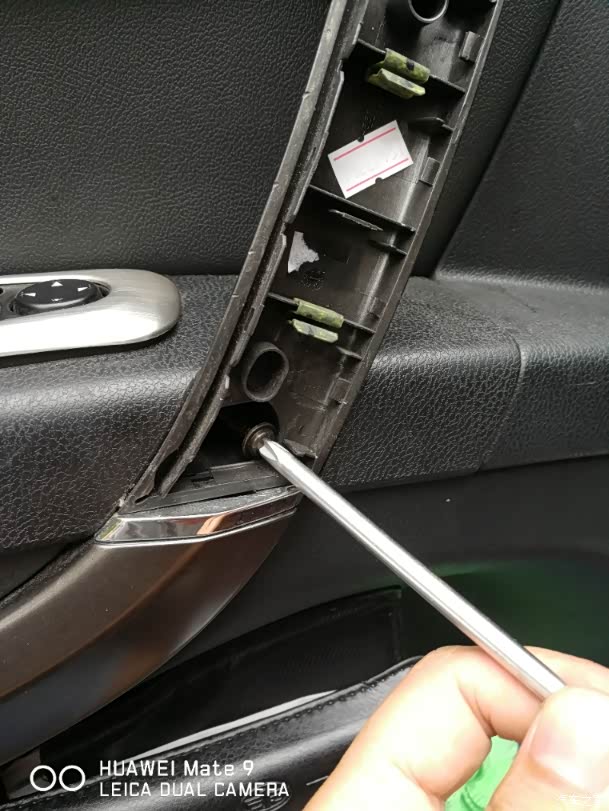 手指所指的位置就是内扶手固定的,下边螺丝的位置。我的车门拆过一次,所以非常松。我这次特意把这颗自攻螺丝的内衬垫也给换了。