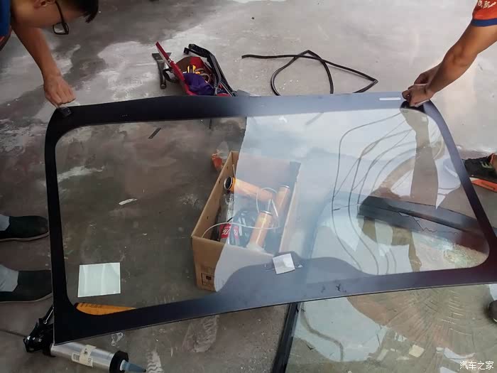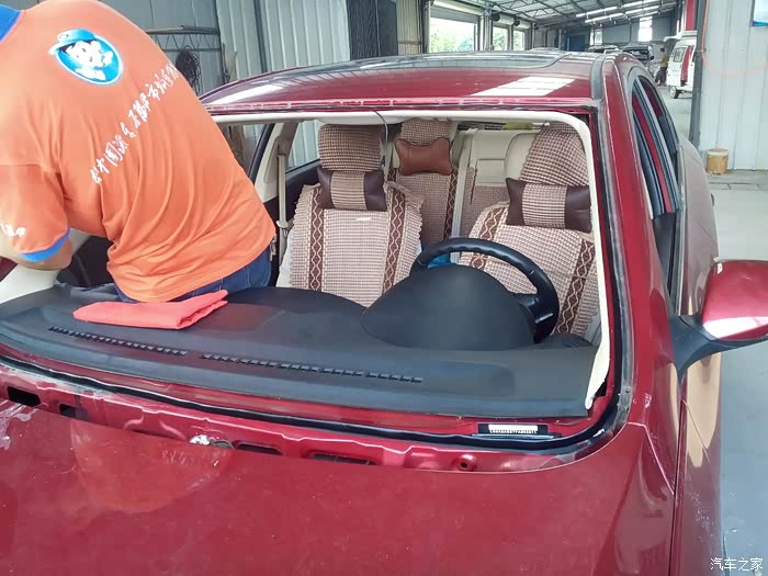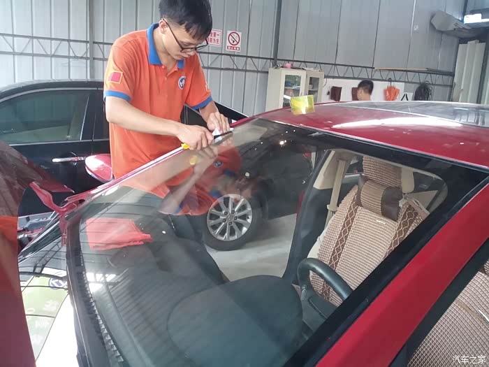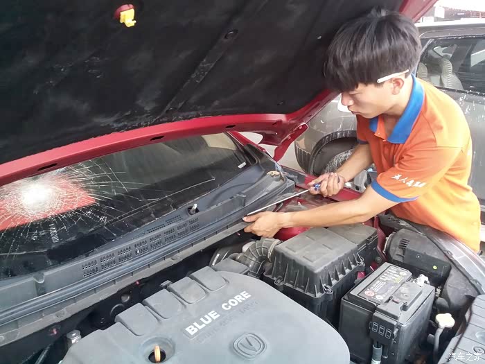 更换玻璃的小师傅开始拆卸前档玻璃胶条