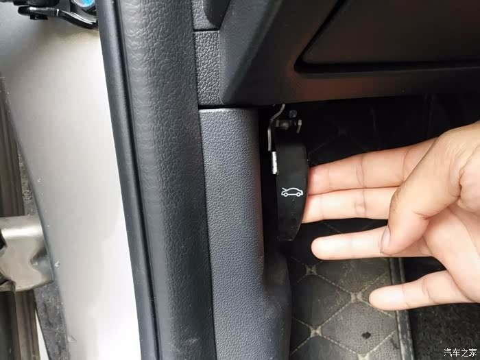 更换小逸空气滤清器非常简单,第一步在车内打开这个标志拉手,它是开启前引擎盖的