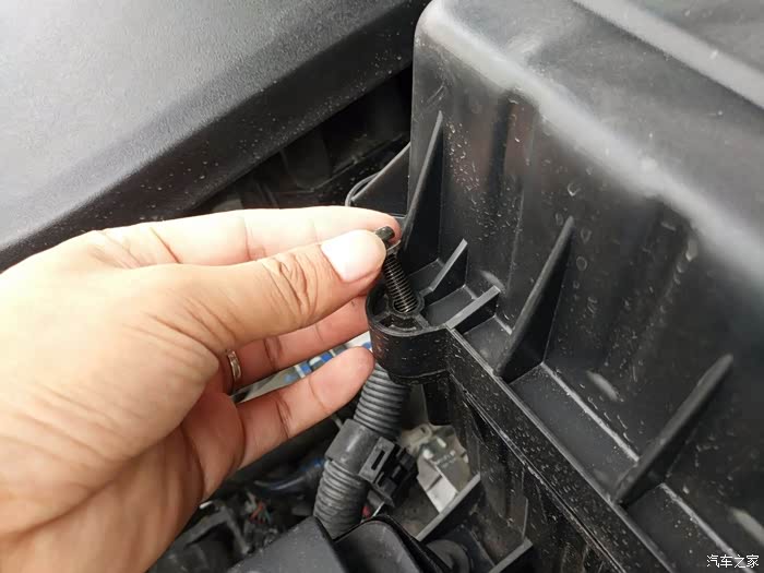 找到这个黑色的盒子,它位于发动机舱右侧,电瓶之上,这就是空气滤清器盒