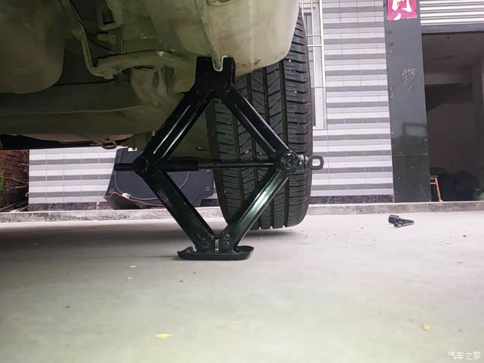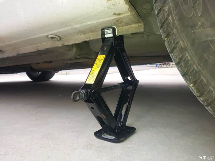 然后用原车配备的千斤顶把被扎轮胎边角支撑好