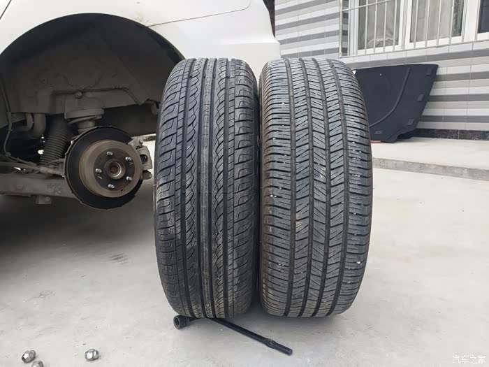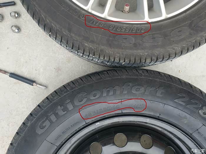 原装轮胎与备胎尺寸特写