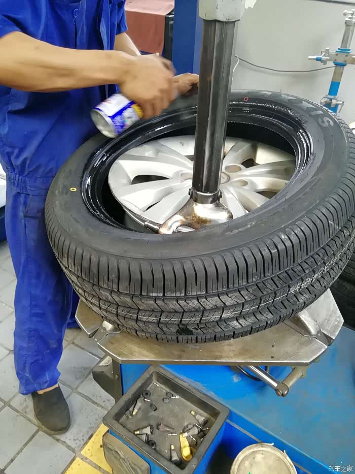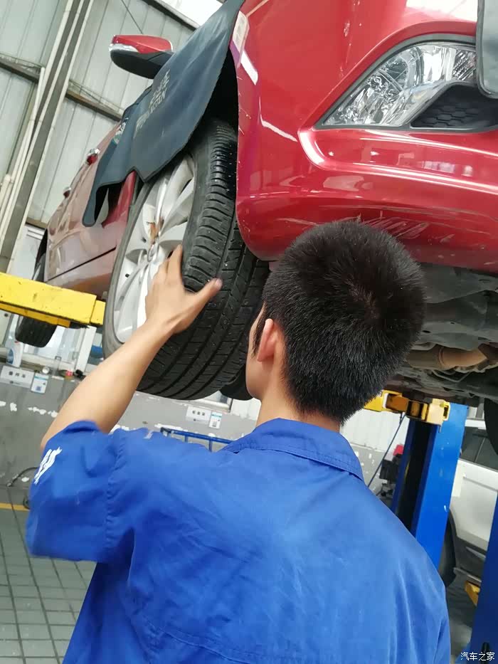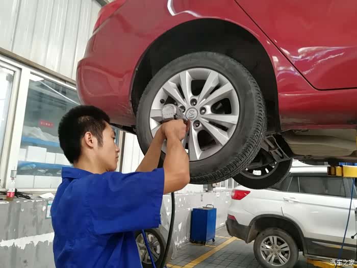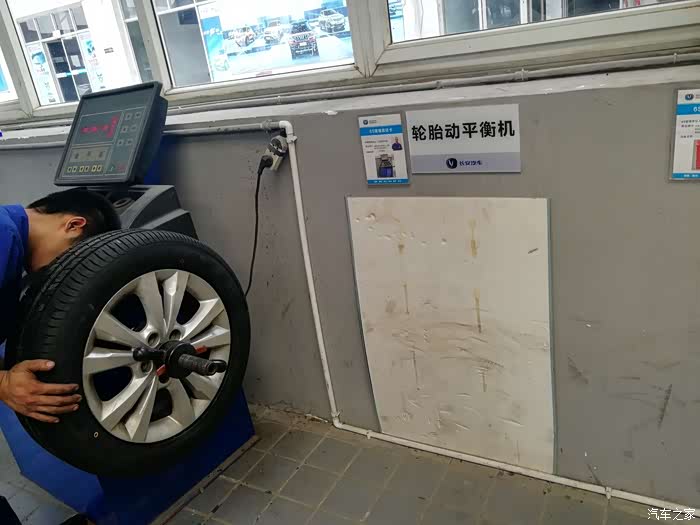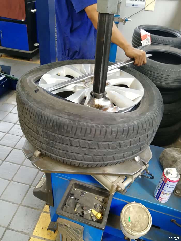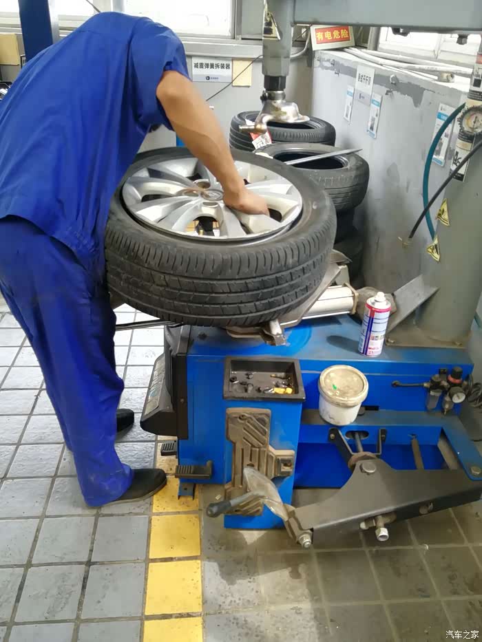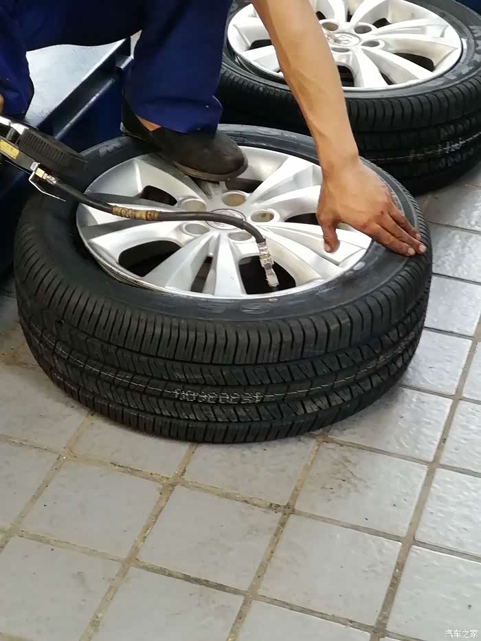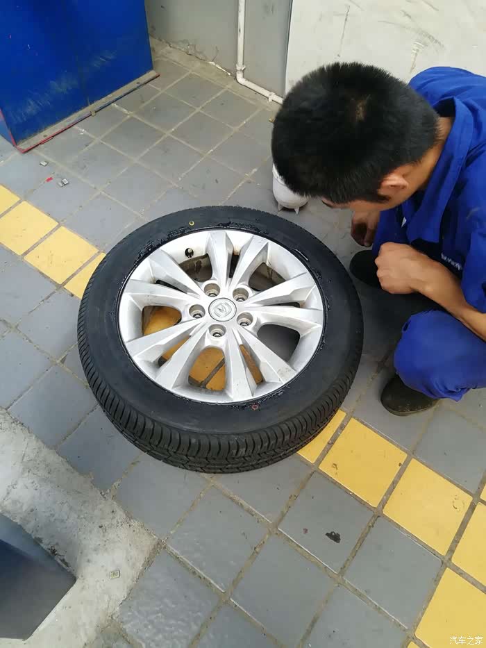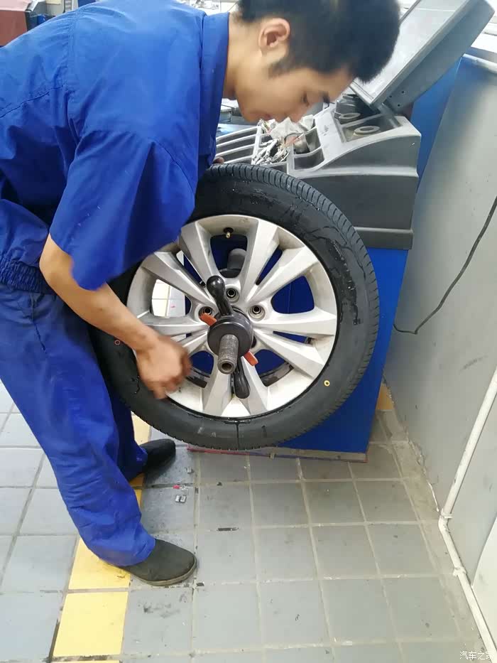 师傅开始逐个进行检查咯,因为只换两个前轮,所以要在四个轮胎中选两个来放在后面。