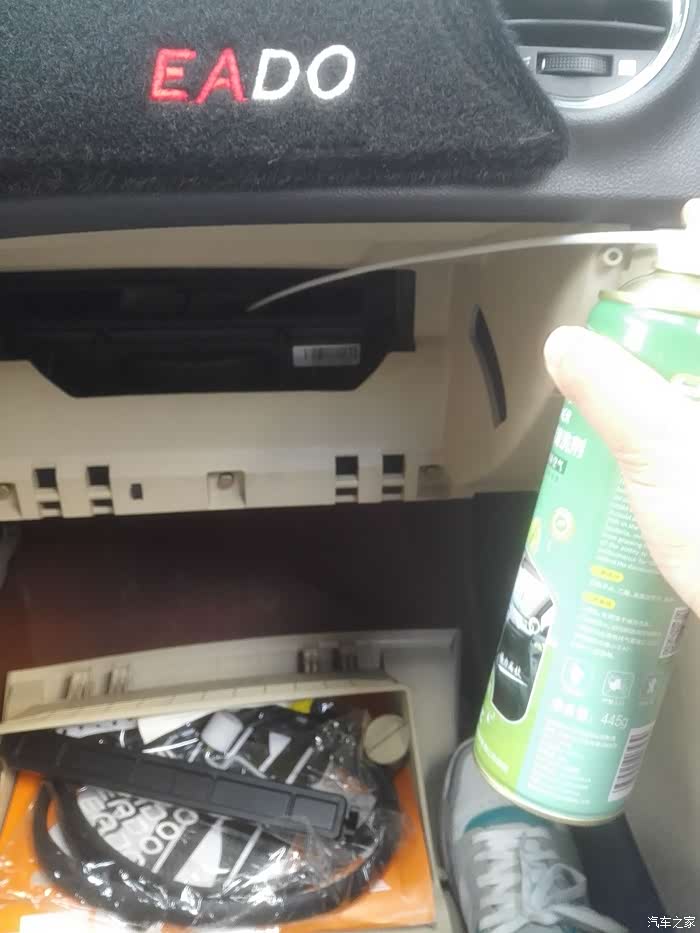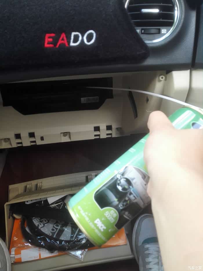 开始往手套箱里面的大风扇喷清洗剂,刚开始忘记关闭空调的出风口,泡沫都吹出来了