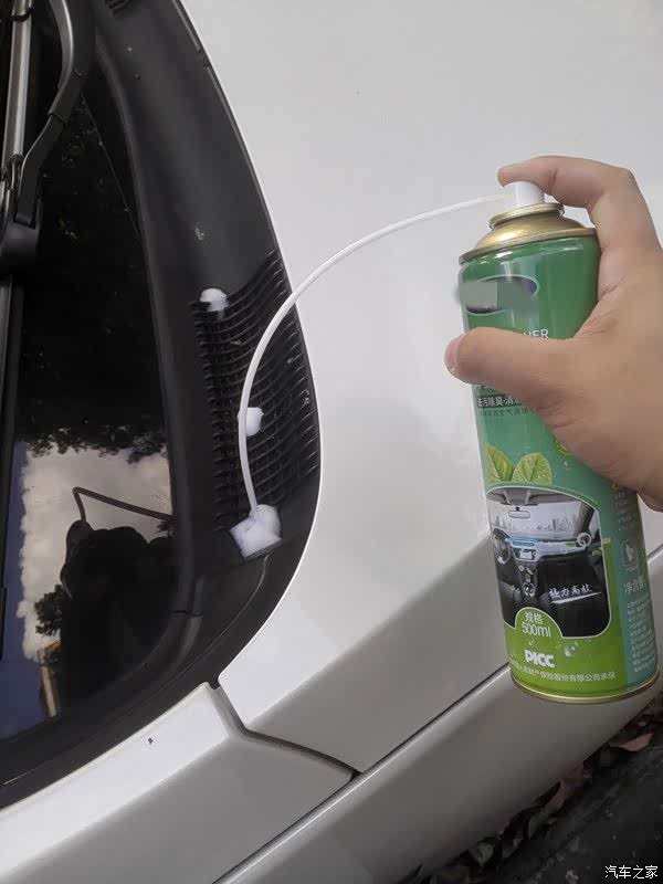 找到前挡风玻璃处的空调进风口,插入喷管,往里面喷清洗剂,每次少喷一点,喷的太快会溢出来