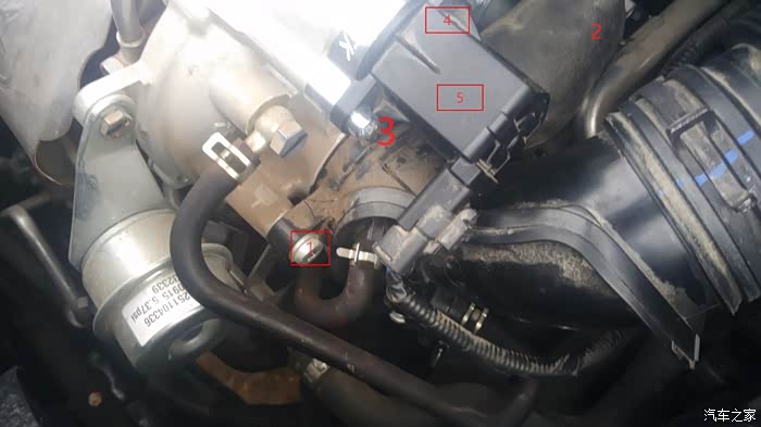 先拆1 2号螺丝,这个是进气管的固定螺丝,拆下后把进气管拜到一边,方便拆3 4 5