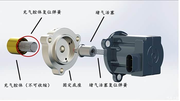 a:黄色的排气阀腔体气压通过其下端的通气孔和增压气压达到平衡。此时排气阀依靠内部弹簧紧紧压住增压区,保持增压压力。
