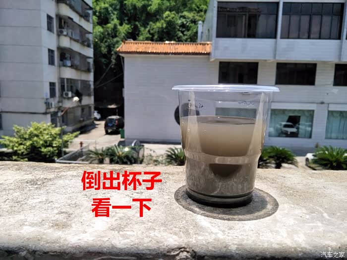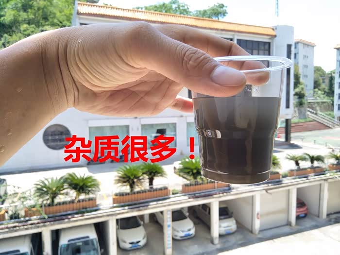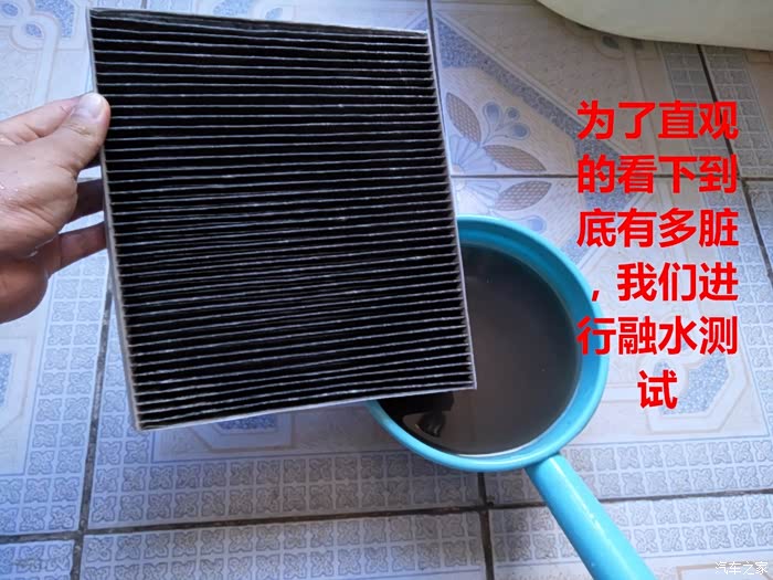 为了检验旧的滤芯到底有多脏,我们继续来看下。把旧的滤芯放到水里泡一下。。。水变得浑浊起来。