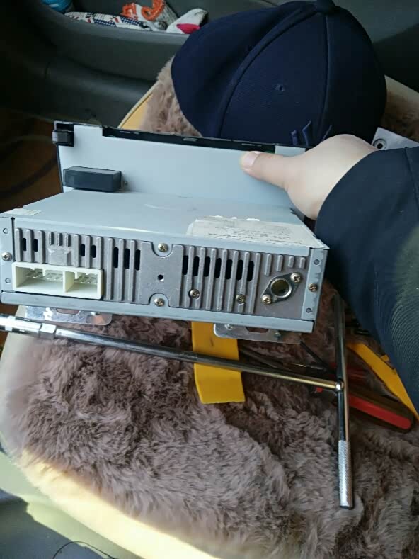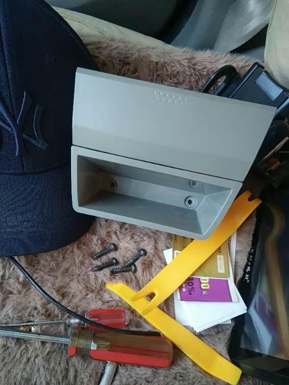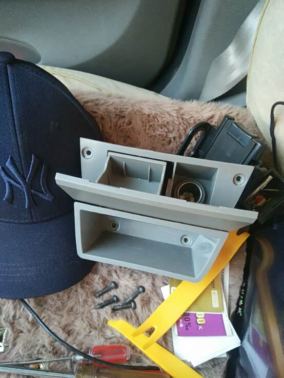 这是拆下来的点烟器盒,四个十字螺丝,拧下来一撬就行!先拆他好拆,从下往上依次拆:先拆点烟器,再拆空调面板,最后才是收音机!