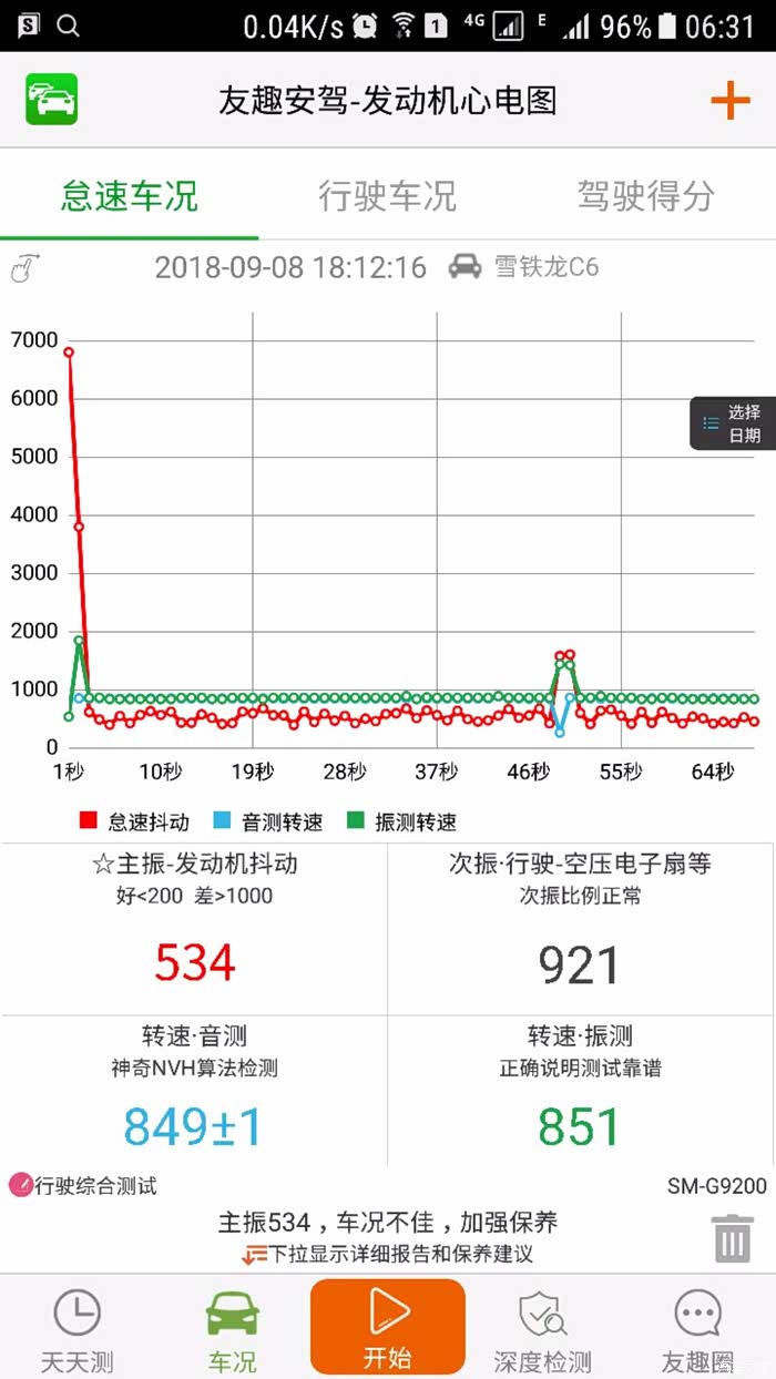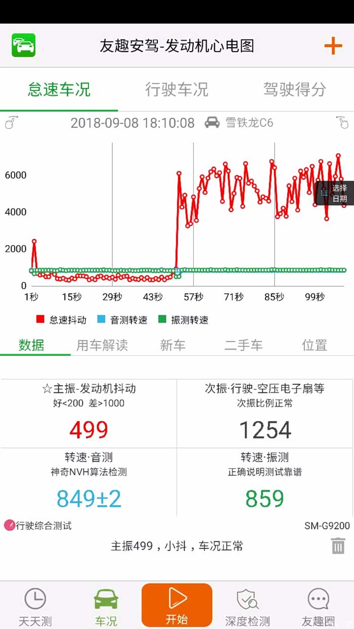这是今天早上上班时,手机放手套箱测试怠速和行驶时的数据。