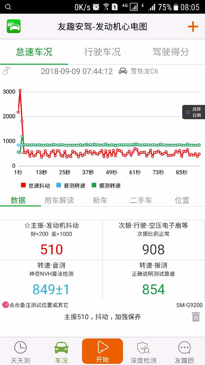 安装好新火花塞后,启动车辆,怠速手机(s6)APP数值,手机放在扶手箱测试结果。