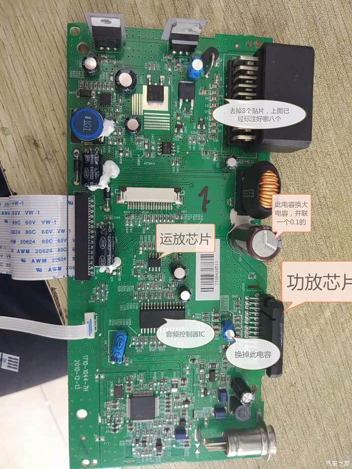 红色圈的电容换25V10000UF大电容,再并联0.1,小的无极的不分正负极,黄色的箭头的蓝色电容换50v47uf,