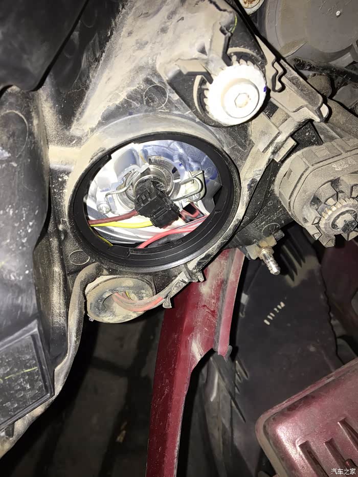 拆下螺丝后就能把大灯拿下来 我是没有把线拔掉因为没必要直接插着换就可以了,拆掉后就能看到各个灯的线,我标记了外面的是近光 里面的是远光。
