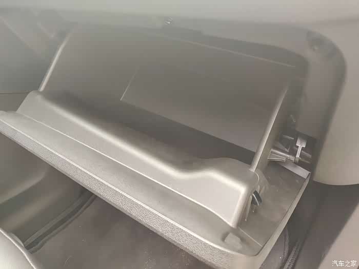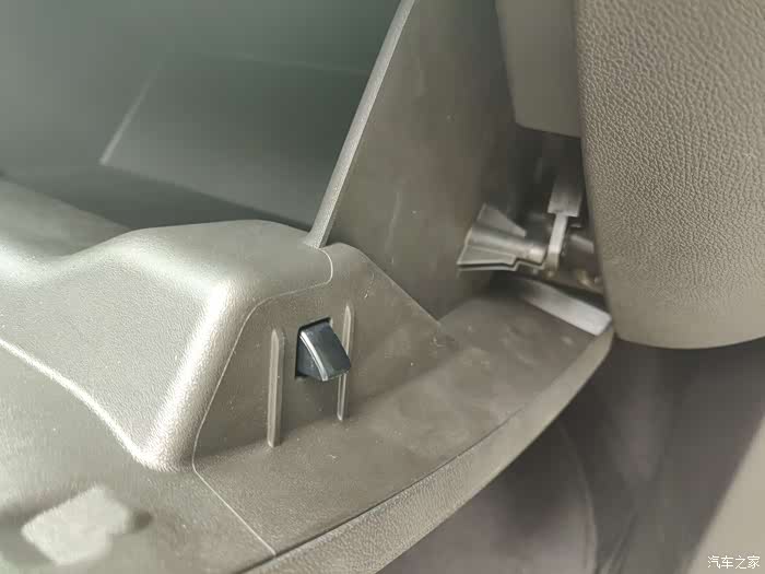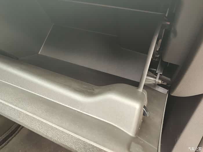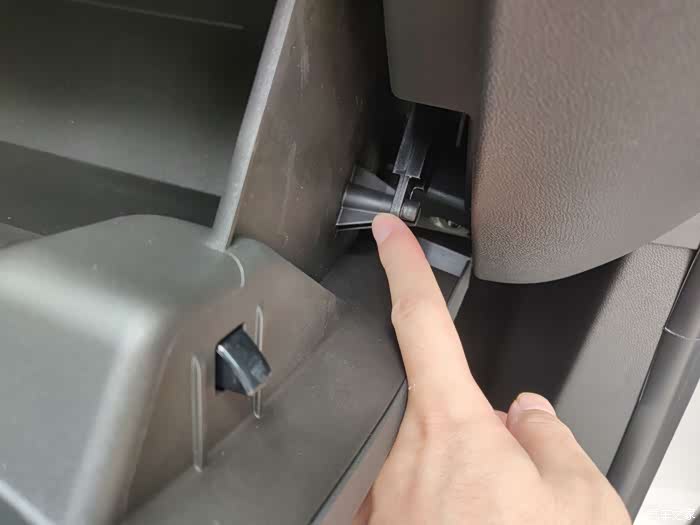 打开手套箱第一步注意观察右侧的这个连接处,这里千万不要用蛮力,不注意的话会把自己的手和手套箱弄坏。正确的方法是用手捏住右侧凸出来的两片,然后另一只手将上部的连接杆往右侧移动下就可以了,基本上是个类似卡扣的设计。