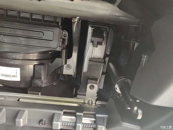 第二步比较简单,在打开右侧的卡扣之后用手伸进手套箱里面靠上侧的部分,左右两侧都各有一个卡扣,在外面用眼睛看不到,要靠手去感觉,不过非常的好找,找到后稍微轻轻一掰就拿下来了,左右两侧卡扣解决后手套箱就非常轻松的被取了下来。