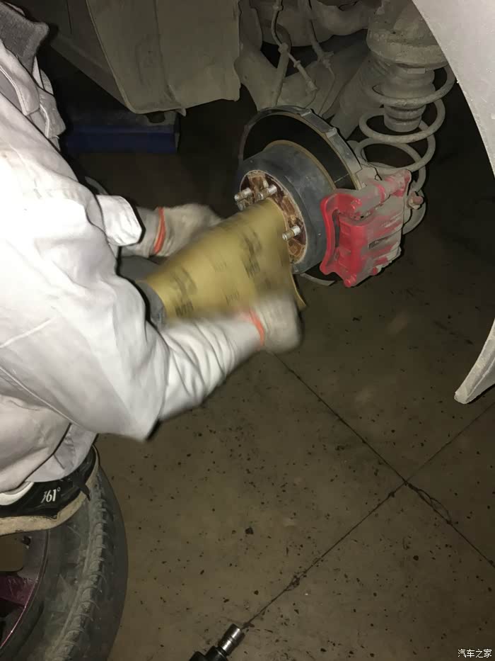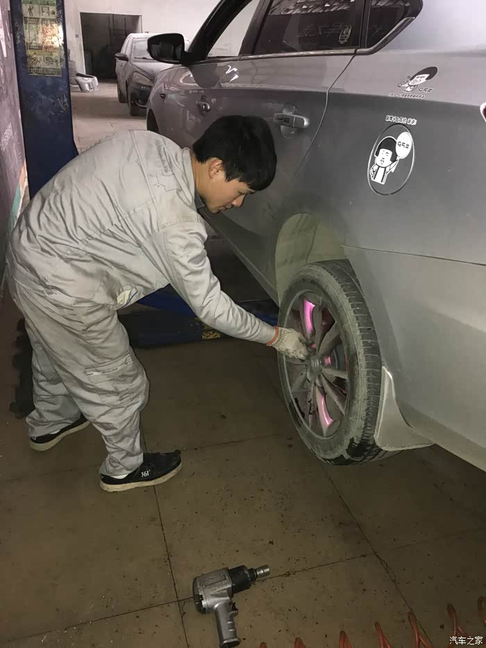 客户店里的师傅已经开始帮我弄了,准备把车子升起来,好取轮胎。