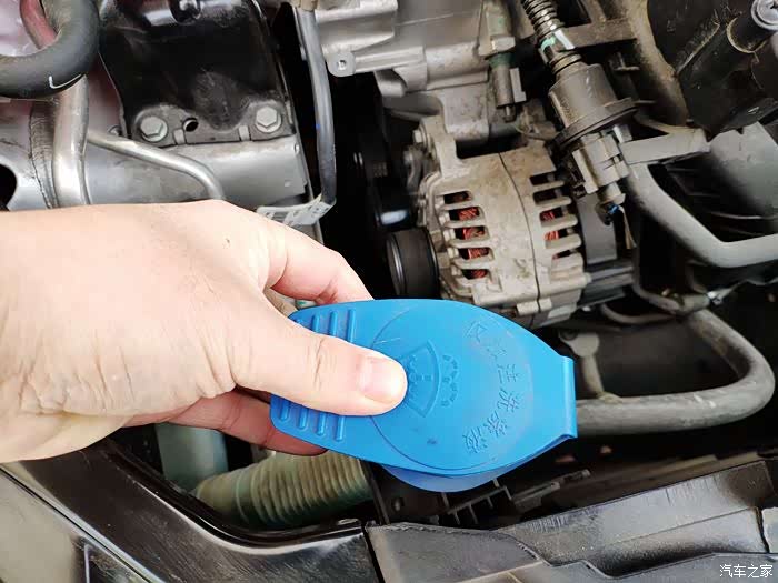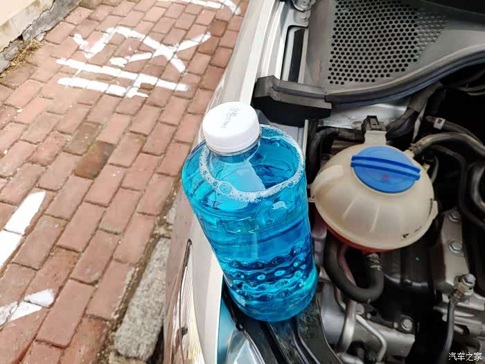 玻璃水和我自己做的漏斗。说换就换。家里有储存的玻璃水。首先在中控台左侧下方找到发动机开关把手,使劲往外一拉,发动机盖会砰地一声弹出来。然后到车头前面中网车标附近,把手伸到里面还有一个发动机盖开关,使劲往上一提,发动机盖就能轻松打开了。打开之后一定要用撑杆支撑好发动机盖,这样才能放开双手轻松的补充玻璃水。玻璃水壶一般在车头附近左侧或者右侧,蓝色的盖子上面有往挡风玻璃上喷水的标志,一般不会弄错。我的玻璃水壶口里面还有一个滤网,防止异物或者玻璃水里面的杂质掉进水壶里面。