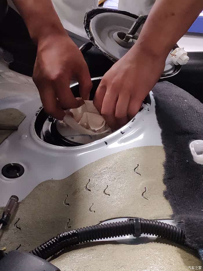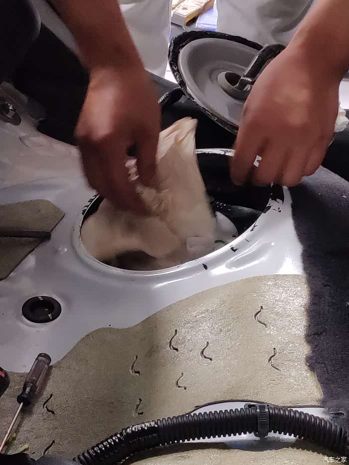 拆下座位之后,发现地毯与车壳之间有这个垫子,不知道是不是止振垫,还比较硬,用鼻子凑上去使劲闻了闻,一点点味道都没有。