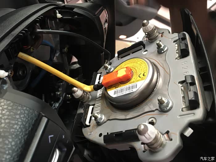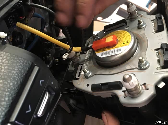 安装气囊线束,先把橘色那个插头插进去,然后再把上面黄色的锁止销按下去就可以了。