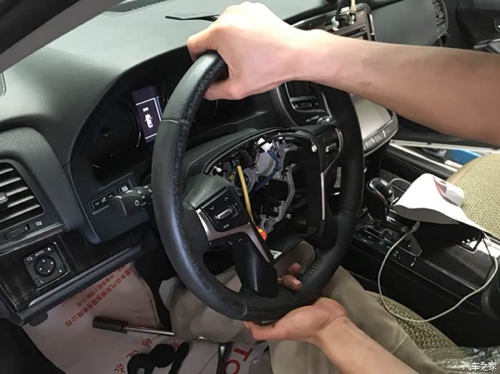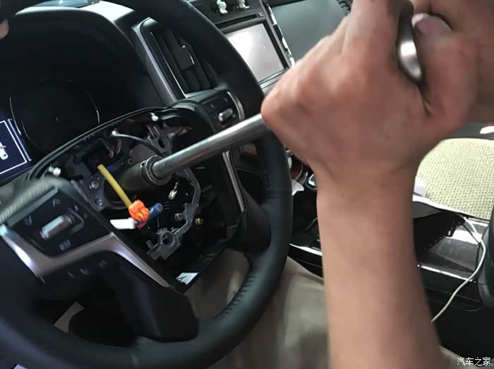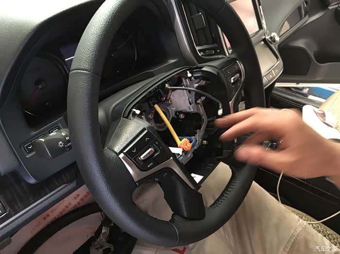 开始拆卸方向盘,左晃晃,右晃晃,因为方向盘和下面的主轴是花键连接,所以比较紧。