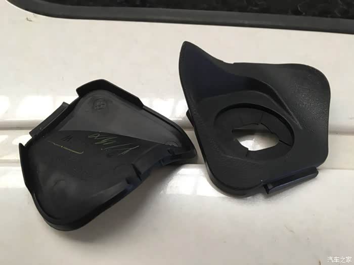 拆下的两个方向盘维修孔盖。右边的这个就是带有定速巡航功能的车辆才使用的。