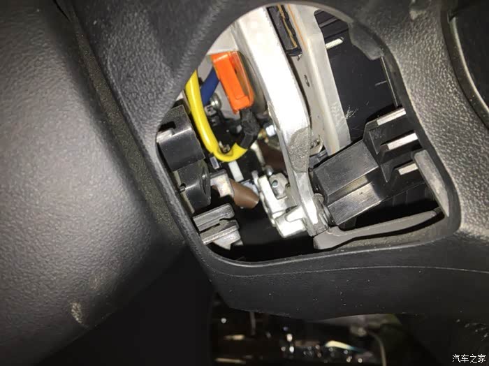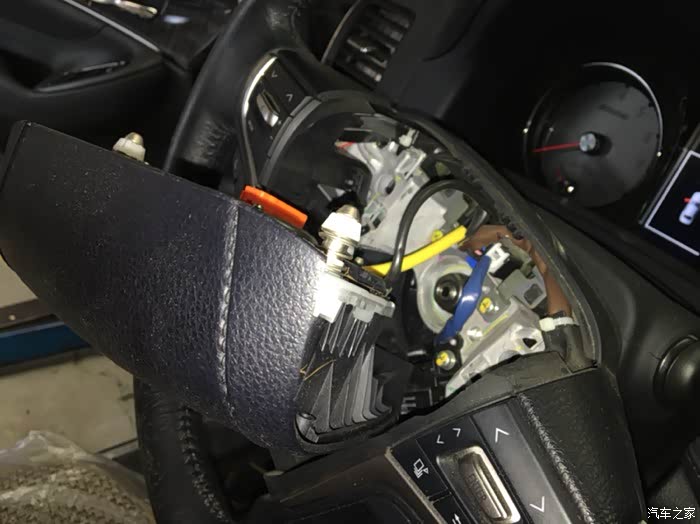 线束固定完毕,把气囊扣上就可以了。现在新款车都把气囊固定螺丝省去了,都用卡簧式的。简化了。