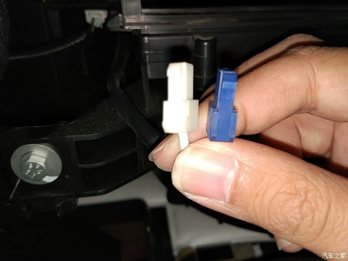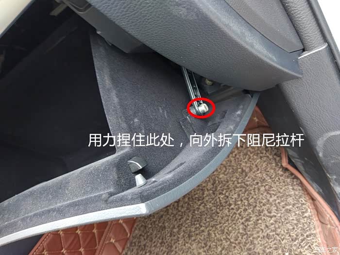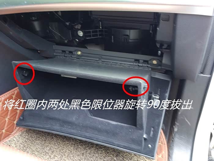 将此处限位旋转90度并拉出,这里建议大家没必要完全拔掉,只要拉出一点能使杂物箱脱出即可。否则安装的时候还需要插回,比较繁琐。